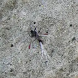 The life cycle of Porphyrophora hamelii is mostly subterranean.[7][30][31] Newly hatched nymphs emerge from the ground in the springtime and crawl until they find the roots of certain grassy plants that grow in saline soil, such as Aeluropus littoralis (Armenian: որդանխոտ (genus Aeluropus),[18][35] literally "worm's grass") and the common reed Phragmites australis.[7][30] The nymphs continue to feed on these roots throughout the spring and summer, forming protective pearl-like cysts in the process. From mid-September to mid-October adults emerge from the ground between 5 a.m. and 10 a.m. to mate.[6][7][35][36] The adult insects, lacking mouthparts, do not feed.[31] Adult males live for only a few days, but adult females can live longer, burrowing into the ground to lay their eggs.[31]