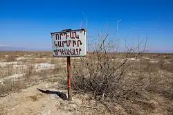 The red dye-producing insects of the Ararat plain were once plentiful: a 19th-century French traveler wrote that shepherds' flocks, when led to drink from the Araxes (Araks) River, would appear bloody from the insects.[4] In the mid-20th century the extent of occurrence in Armenia was 100 km2 (39 sq mi) with a recorded distribution that included the Ararat and Armavir provinces in Armenia as well as the Turkish, Iranian, and Russian Caucasus, but by the 1990s the extent of occurrence in Armenia had shrunk to about 20 km2 (7.7 sq mi), mostly in Armavir Province.[7][30][37] During the Soviet period, desalination of the Armenian salt marshes to create "economic and agricultural regions", and the creation of lakes for fisheries, "severely restricted the [habitable] area for the insects and [endangered their] existence."[35]