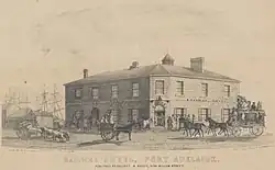 The Port Admiral Hotel was built by Robert Sanders and opened in 1849.[1] The hotel was originally named the 'Railway Hotel' to reflect a proposed horse drawn train line.[2] However, subsequent operator Charles Calton decided to rename it after a pub he had previously operated, giving the hotel its current name.[1]