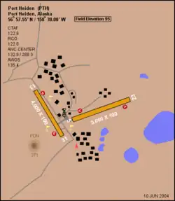 Port Heiden Airport (IATA: PTH, ICAO: PAPH, FAA LID: PTH) is a state-owned public airport located six nautical miles (7 mi, 11 km) northeast of the central business district of Port Heiden,[1] in the Lake and Peninsula Borough of the U.S. state of Alaska. The scheduled airline services to King Salmon Airport are provided by Peninsula Airways (PenAir).[2]