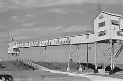 The name for the community derives from the Freeport Sulphur Company in the early 1930s, when it set up logistics, refining, storage and shipping operations to support its Frasch Process sulphur mine at Lake Grande Ecaille, located 10 miles west of the town in the nearby marsh.[3] The Grande Ecaille mine was among the largest sulphur deposits in the world when it began operation in 1933, and remained in production until 1978. Over time, as other discoveries were made, the Freeport Sulphur Company also used the Port Sulphur facility to support their other Frasch Process sulphur mines located at Garden Island Bay, Lake Pelto, and Caillou Island; a land-based mine at Chacahoula; the first offshore sulphur mines at Grand Isle and Caminada Pass; and a large operation 50 miles offshore from the Mississippi River Delta in 300 feet of water, at Main Pass Block 299 in the Gulf of Mexico. The facility was also used to process and ship recovered sulphur obtained by oil and gas refining. The terminal was able to filter and store liquid hot molten sulphur in large insulated heated tanks, and "vat" liquid sulphur into acres of long term dry storage by forming blocks of bright yellow sulphur by spraying molten sulphur into metal forms on the ground and allowing to cool. The site is valuable because of its proximity to sulphur producing areas near the Gulf of Mexico, its docking sites along the Mississippi River and back bay marsh.