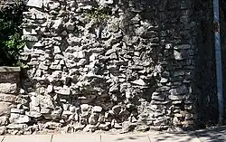 The wall is, on average, about 5 metres (16 ft) high and 2 metres (6 ft 7 in) thick. It was built without any substantial foundations, and is faced with roughly squared blocks of stone ashlar and filled with rubble.[6] It originally had a walkway along the inside and battlements along the top, and at least 11 outward-facing semi-circular towers, each about 8 metres in diameter. In some stretches there was a dry ditch outside the wall.[4] It is uncertain whether the wall originally extended from the castle wall itself, or from a point across the Dell, a steeply sided valley which forms a natural moat on the south side of the castle.[3][5]