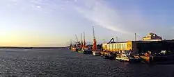 The port is located in the estuary formed by the Odiel and Río Tinto rivers.[3] It is operated by the Port Authority of Huelva.[4] It is divided into two sectors: the Inner Port (in the city) and the Outer Port (the main port). The Inner Port's single wharf, the East Wharf, is the one used for smaller traffic including tourist boats. The Outer Port, with six wharves, is located to the south of the River Tinto.