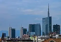 Pelli Clarke Pelli designed the largest part of the development, the "Garibaldi" area (near Garibaldi railway station), with office and retail compounds extending over 230,500 square metres.[9] It is centered on the Unicredit Tower complex, that features three office towers, of which the largest, a 31-story, 231 metres high asymmetrical tower culminating in a sculptural, 80m stainless steel spire, is currently (as of 2017) the tallest building in Italy.[10]