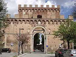 Porta Romana is one of the portals in the medieval Walls of Siena. It is located on Via Cassia in Siena, region of Tuscany, Italy. The gate exits near the Basilica of San Clemente and leads south out of town to Via Enea Silvio Piccolomini. 43°18′48″N 11°20′22″E / 43.313264°N 11.339478°E
