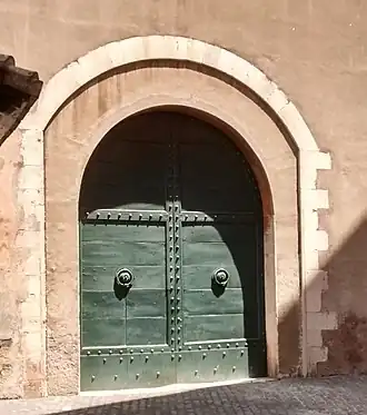 Porta San Pellegrino is a gate in the outer wall of Vatican City. It is located beside Bernini's Colonnade and the small Vatican post; it is also known as Porta Viridaria. Rebuilt by Pope Alexander VI in 1492, the gate is surmounted by his papal coat of arms. The gate is little used.[1] Originally part of the ninth-century Leonine Walls commissioned by Pope Leo IV to defend St. Peter's Basilica from Saracen raids, it once marked the principal northern entrance for pilgrims. Although its military purpose has long passed, the gate's austere ashlar masonry and heraldic reliefs still evoke its defensive and ceremonial significance.