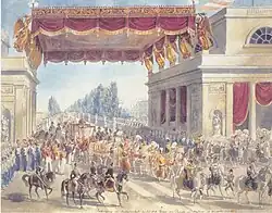 The name "Porta Venezia" (literally: "Venice Gate") was formally given in 1862, possibly in the hope that Venice would soon join Milan in the newly born Kingdom of Italy.[6] Previously, the gate was mostly called "Porta Orientale",[7] with "Porta Renza" being another widely used name. This latter name has been consistently in use through the centuries; for example, it is referred to in Francesco Guicciardini's History of Italy, dating back to the mid-16th century,[8] as well as in Giovanni Verga's works of the late 19th century,[9] and is still remembered (although not commonly used) by the Milanese population today. Stendhal, who lived in Milan, uses a variation Porta Rense.[7]