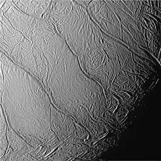 View of Saturn's moon Enceladus' South Polar Region, including four fractures informally named tiger stripes.