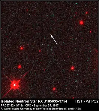 The first direct observation of a neutron star in visible light, recorded by the Hubble Space Telescope in 1997.