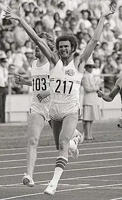 Juantorena made it to the 800 m Olympic final, and led the field for most of the race, eventually winning in a world record time of 1:43.50.[55] He was the first non-English speaking athlete to win Olympic gold in this event. Three days later, he also won the 400 meter final, setting a low-altitude world record at 44.26.[56] By winning the 400 meters, he became the first athlete since Paul Pilgrim at the 1906 Intercalated Games to do such a double at an Olympic sports event, and was the only man to do so at an officially recognized Olympics.[57][58]