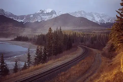 Canadian National Railway track along the Athabasca River at the mouth of Brule Lake in Alberta, Canada