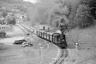 ÖBB 399.02 leaves Steinbach-Groß Pertholz station on the Waldviertel Narrow Gauge Railways on the line to Groß Gerungs, Lower Austria.