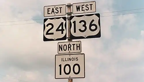 A photo from 1960 showing a sign assembly along Route 27 for Route 18 in New Brunswick, New Jersey. At the time, Route 18 was signed as east–west; it is now posted as north–south.