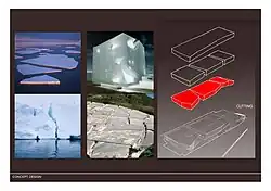 The building takes the shape of an enormous rock set on the ground, with entrances located in areas where it appears as though pieces of the rock-face have been broken off. The cuts in the rock define three distinct volumes linked together by the shopping malls, which form the core of the building.[10]
