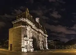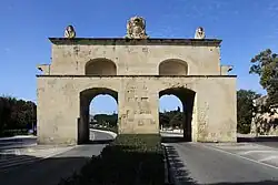 Portes des Bombes (Maltese: Bieb il-Bombi, Italian: Porta delle Bombe, meaning "Bombs' Gate"), originally called Porta dei Cannoni (meaning "Cannons Gate"), is an ornamental arched gate in Floriana, Malta. It was built in 1721 as an advanced gate within the faussebraye of the Floriana Lines, and it was enlarged with the construction of a second archway in 1868. The ramparts on either side of the gate have since been demolished, leaving the gate looking like a triumphal arch.[1]
