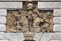 The arch was designed by François Dorbay, after the model of the Porte Saint-Denis in Paris. [1] Its construction was completed in 1693. Its rusticated surface is crowned by a Doric entablature, suitable to a martial monument. Its later panels in bas-relief and inscriptions glorifying King Louis XIV of France were added in 1715.