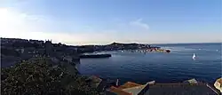 St Ives is on the western shore of St Ives Bay, its harbour sheltered by St Ives Island (a headland) and Smeaton's pier. Close to the harbour, in the old part of the town, the streets are narrow and uneven while its wider streets are in the newer parts of the town on rising ground.[9] The town has four beaches: Porthmeor a surfing beach, Porthgwidden a small sandy cove, Harbour by the working port and Porthminster which has almost half a mile of sand.[44] St Ives has an oceanic climate and has some of the mildest winters and warmest summers in Britain and Northern Europe. It is therefore a popular tourist resort in the summer, and also benefits from an amount of sunshine per year that is above the national average.[45] The South West Coast Path passes through the town.[46]
