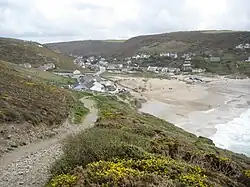 Its name comes from the Cornish words "porth" and "tewyn" to mean landing place at the sand dunes.[1]