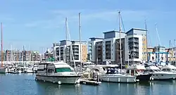 This waterfront development is known as Port Marine. The area has varied styles of houses and apartments, including an area built in the style of a fishing village, which is modelled on the Cornish seaside town of Polperro with narrow streets and multi-coloured properties.