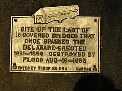 In August 1955, during the remnants of Hurricane Diane, three of the four spans of the timber bridge washed away. Hurricane Diane was the wettest hurricane to ever hit the North American continent and caused record flooding throughout the northeastern US, but particularly the Delaware River watershed.