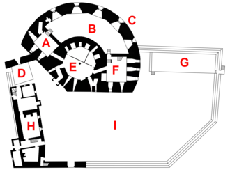 The keep is two storeys high, built of ashlar Portland stone.[1] Historic England considers it to form "one of the best preserved and best known examples" of the Henrician forts.[1] In the centre of the ground floor is the octagonal great hall, now fitted with large Victorian windows, which would have originally providing living space for the garrison.[45] Off the great hall are wings holding the gunners' quarters and the castle's kitchen, the latter equipped with a large, 16th-century fireplace.[46] Running around the front of the keep is the gun room. This was originally a two-storey gun battery with embrasures for five guns on the ground floor and four more above on the first floor, with the southern end of the ground floor subdivided into four barrack rooms.[47] The ground-floor embrasures were designed with vents to allow the smoke from the guns to escape.[48] Both the wooden roof that formed the first-floor gun platform and the internal wooden partitions have been dismantled, however, and the chamber is now open to the air.[47] It now houses a variety of 18th and 19th century cannons.[13]