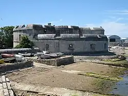 Portland Castle continued in use through the 18th century, primarily protecting vessels against privateers, including merchant vessels carrying stone from the local Portland quarries.[22] Reports in 1702 and 1715 complained about the dilapidated condition of the fortification – the sea had washed away 112 feet (34 m) of its foundations – and the number of artillery pieces was reduced to seven.[23] By 1779, the castle had a caretaker garrison of three men and eight guns, and reportedly had not been repaired in the previous 30 years.[24] During the Napoleonic Wars, the castle's guns were increased to comprise six 24-pounder, six 12-pounders and two 9-pounder guns (10.9 kg, 5.4 kg and 4.1 kg respectively), but the fortification remained in a poor condition overall.[24]