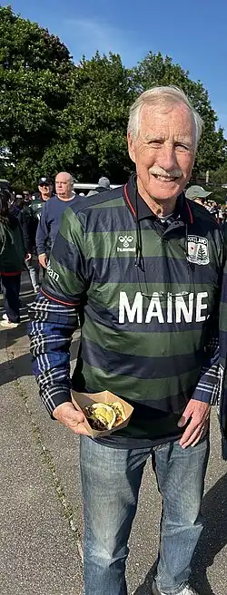 The inaugural home jersey was unveiled on November 21, 2024, during a sold-out event at the State Theatre in Portland attended by Maine Governor Janet Mills.[28][29] The inaugural home jersey, dubbed the "Woods and Water Kit," features forest green and navy blue hoops with red accents on the collar and sleeve cuffs.[30]