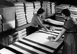 During World War II, the United States federal government granted the Portland Woolen Mills contracts for wool blankets.[18] In 1943, the factory won an Army-Navy "E" Award for their production.[19] By 1950, the Portland Woolen Mills had become the largest wool manufacturer in the United States west of Cleveland, Ohio.[20] In 1951, the Portland Woolen Mills won a US$200,000 contract for the United States Armed Forces.[21] From its 1935 to 1952, the Portland Woolen Mills were led by executive director Charles H. Carter, who died two years after his retirement.[22] His son Charles H. Carter, Jr. succeed him in that position. In 1960, the Portland Woolen Mills announced it would cease operations. At the time of the closure, the factory employed 100 people. Carter cited increasing production costs due to foreign competition as the reason he closed the mill.[23]