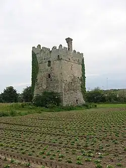 Portrane Castle (sometimes called Stella's Tower) is a 3-storey late medieval castellated tower house adjacent to St. Catherine's housing estate. Jonathan Swift's 'Stella', Esther Johnson is said to have stayed there and given the castle its unusual nickname. The inquisition of 1541 mentions the castle as being a substantial structure with associated outbuildings, including a threshing house and hemp yard, while the Civil Survey of 1655 describes this site as an old castle with a thatched hall adjoining owned by the parsonage of Portrane. A later brick chimney can also be seen at the top of the tower.[7][8] Samuel Lewis describes the castle as long since deserted in his Topographical Dictionary of Ireland in 1837 and notes that the last occupant was Lady Acheson.[9]