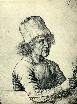 Barbara Holper was the daughter of Hieronymus Holper, under whom Albrecht the Elder served his apprenticeship as a goldsmith.[20] The two men became friends, and when she came of age Holper gave his daughter into marriage when Dürer senior was 40 and she was 15.[18] The couple were compatible, well-matched and fond of each other. Yet their son's writings detail their difficult lives and many setbacks; three of their 18 children survived into adulthood – 17 of whom had been born by the time of this portrait.[21] After her husband died Barbara was destitute and went to live with her son.[22] After she in turn died in 1514, her son wrote "This my pious Mother ... often had the plague and many other severe and strange illnesses, and she suffered great poverty, scorn, contempt, mocking words, terrors, and great adversities. Yet she bore no malice. Also she died hard ... I felt so grieved for her that I cannot express it."[23]