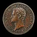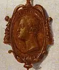 Bia has her hair parted in the middle of her forehead and a falling bob, with two carefully tied braids framing the face. She wears pearl earrings, a gold chain with a pendant or medallion with her father's profile on it, emphasizing her bond with her father.[3] The medallions portrait of her father is modeled after a portrait of Cosimo by Pontormo and then made into a medallion by Domenico di Poli.[4] The appearance of the medallion in the portrait helped to identify the subject as a daughter of Cosimo.