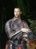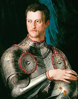 The Portrait of Cosimo I de' Medici is a painting by the Italian artist Agnolo di Cosimo, known as Bronzino, finished in 1545. In his position as court painter for the Medici, Bronzino was author of several portraits of Grand Duke Cosimo I de' Medici. In this portrait, Cosimo is represented in his younger years, commanding and proud; and to quote Giorgio Vasari, "clad with white armor and a hand over the helmet". It has been identified as having been painted in the Medicis' Villa of Poggio a Caiano in 1545.