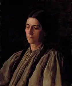 Referring to Eakins' achievement in the second portrait, Homer wrote: "It is one of the first portraits in which he opened himself up to a particular woman rather than visualizing her according to his earlier intellectualized notion of a woman cast in a masculine mold. The painting marks the beginning of Eakins's ability to empathize with women in portraiture."[20] Goodrich called it "one of his most sympathetic, intimate portraits of a middle-aged woman."[6]