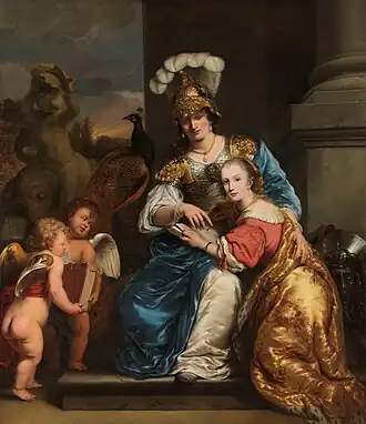 It shows Margarita Trip (1640–1714) and her sister Anna Maria Trip (1652–1681), both daughters of the merchant Louis Trip and his wife Emerentia Hoefslager. Trip also commissioned the imposing Trippenhuis, over two of whose fireplaces this painting and Portrait of Johanna de Geer and her Children as Charity originally hung.[2] On the left two putti carry a large book, possibly in an allusion to the love of knowledge. In the background there is see a balustrade with a park-like area behind, and a fountain in the shape of a putto (or Cupid) on a dolphin. This motif comes from Roman art. There is also a peacock on the balustrade. On the far right against a wall is the shield of Minerva with the head of Medusa on top.