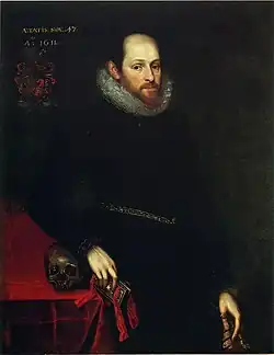 A painting now called the Ashbourne portrait was identified as a portrayal of Shakespeare in 1847, and it currently hangs in the Folger Shakespeare Library. The painting was reproduced as Shakespeare in the mid-19th century as a mezzotint by G.F. Storm.[29] In 1940 Charles Wisner Barrell examined the portrait using X-ray and infrared photography, as well as rubbings of the concealed paint on the sitter's thumb ring, and concluded that the painting was a retouched portrait of Edward de Vere, 17th Earl of Oxford, painted by Cornelius Ketel.[30] In 1979, the painting was restored, and a coat of arms uncovered which identified the sitter as Hugh Hamersley. The restoration revealed that the portrait had been retouched to have the hairline recede, while the inscribed age had been altered by one year and Hamersley's coat of arms had been painted over.[31] Nevertheless, some Oxfordians continue to support the de Vere identification, claiming that the fashions worn by the sitter date the painting to about 1580 when Hamersley would have been only 15.[32]