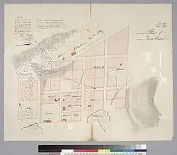 Portsmouth Square is located on the site of the first public square, Plaza de Yerba Buena,[5] established in the early 19th century in the Mexican community of Yerba Buena. The site was first used as a public gathering site in 1833; it was set aside as an official plaza in 1835.[6]: 19–20 Jean Jacques Vioget was commissioned to survey the settlement in 1839, and Vioget imposed a grid of streets centered on the plaza overlooking the cove.[6]: 20