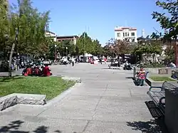 Portsmouth Square (traditional Chinese: 花園角; simplified Chinese: 花园角; pinyin: Huāyuán jiǎo; Jyutping: Faa1jyun4 Gok3), formerly known as Portsmouth Plaza,[1] and originally known as Plaza de Yerba Buena,[2][3] or simply La Plaza,[4] is a one-block plaza (57,516 sq ft (5,343.4 m2)) in Chinatown, San Francisco, California. Portsmouth Square is the first park in San Francisco, predating both Washington Square (1847) and Union Square (1850). Established in the early 19th century, during the period of Mexican California, the plaza was renamed following the U.S. Conquest of California in honor of the USS Portsmouth, the American ship which captured the city. It is bounded by Kearny Street on the east, Washington Street on the north, Clay Street on the south, and Walter Lum Place on the west.
