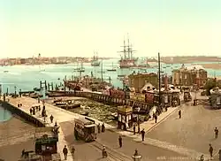 Camber Dock is the oldest developed part of the Portsmouth Harbour complex.[9] Lying within the historic area of Old Portsmouth, it is part of Portsmouth Point that lies outside the original fortified boundaries of Portsmouth. After improvements in the King James's and Landport Gates and the areas military defences,[10] civilian building of dockside storage and ancillary servicing facilities began from 1590.[11] With major ships anchored at Spithead, from the 18th century the surrounding area became noted as a popular but lewd area for visiting sailors.[11]