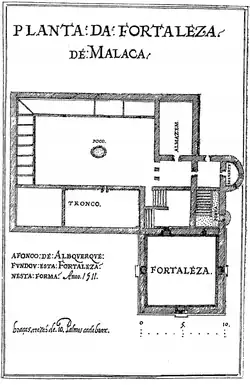 The early core of the fortress system was a quadrilateral tower called Fortaleza de Malaca. Measurements were given as 10 fathoms per side with a height of 40 fathoms. It was constructed at the foot of the fortress hill, next to the sea. A circular wall of mortar and stone with a well in the middle was constructed to its east.