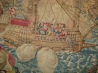 The oldest known estimates regarding its armament range from 80 to 200 guns, including a large chase gun.[5] It was among the earliest recorded vessels to have gun ports with lids, which were opened to expose the cannon as a show of firepower.[6]