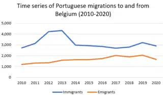 In fact, since 2010 around 18,100 Portuguese have left Belgium. The emigration of Portuguese citizens has been constantly increasing since the first available year of the time series (2010). It is worth noting that, starting from 2014, the Portuguese unemployment rate has steadily fallen and the economic outlook has bettered. The sole exception occurred in 2020, during which a decline in the influx of Portuguese individuals was observed. This decline is most likely attributable to the Coronavirus pandemic.[53][54] Similarly, the influx of Portuguese migrants has steadily decreased since 2013, with the exception of 2019.