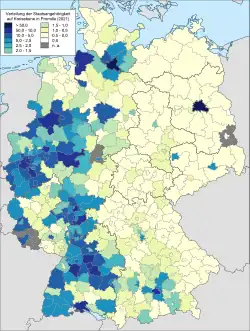 The Portuguese community in Germany retains strong ties with its homeland and, between 2000 and 2021, it has sent approximately 4.5 billion euros (€) to Portugal in remittances. In the same timeframe, Germans in Portugal (numbering around 20,500 individuals)[42] have sent approximately 136.4 million euros (€) to Germany.[43]