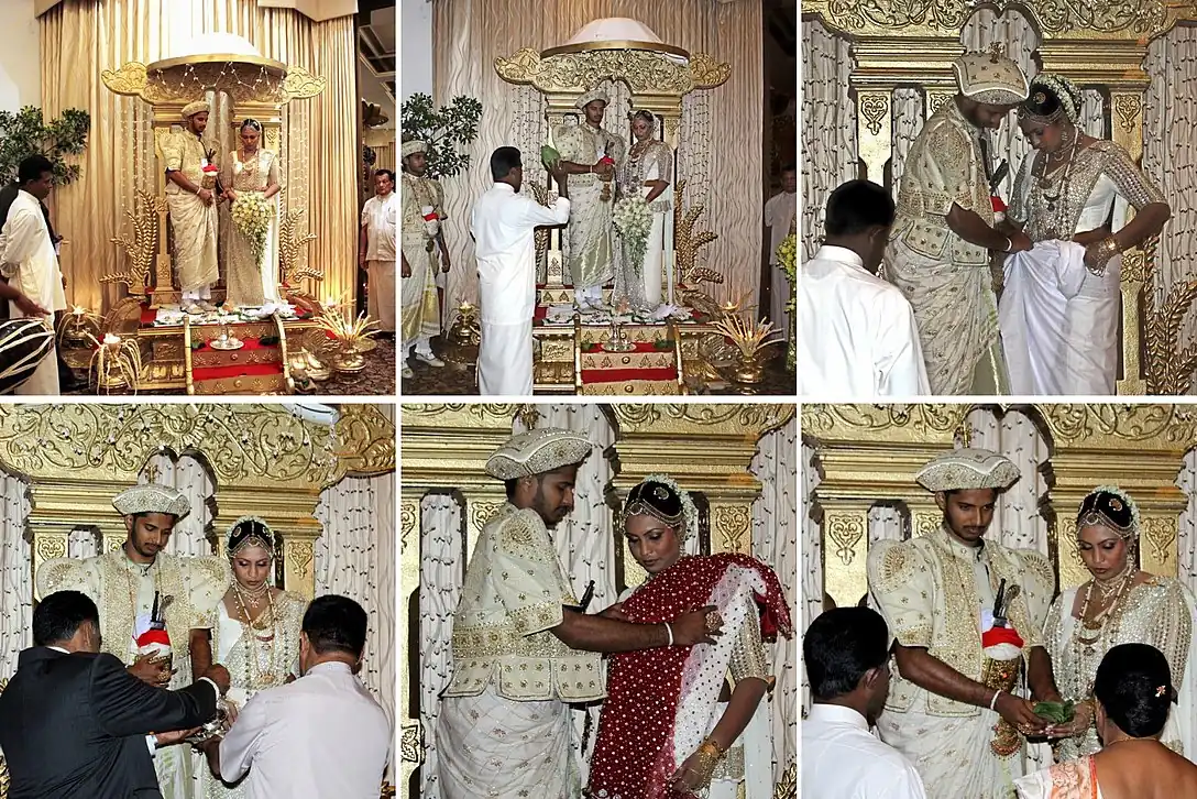 The bride's father places the right hand of the bride on that of the groom as a symbolic gesture of handing over the bride to the groom. The groom's brother hands over a tray with seven sheaves of betel leaves with a coin placed in each. The groom holds the tray while the bride takes one leaf at a time and drops it on the Poruwa. The groom then repeats this process. The groom's brother hands a gold necklace to the groom who in turn places it on the bride's neck. The maternal uncle enters the Poruwa and ties the small fingers of the bride and groom with a single gold thread (to symbolize unity) and then pours water over the fingers. Six girls will then bless the marriage with a traditional Buddhist chant (Jayamangala Gatha). The groom presents to his bride a white cloth which in turn is presented to the bride's mother. This is an expression of the groom's gratitude to his mother-in-law.