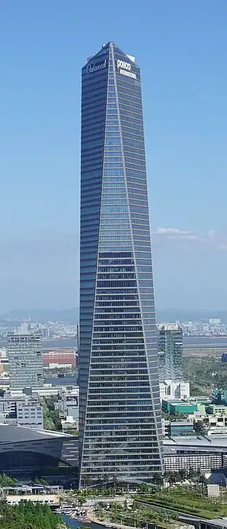 The Posco Tower-Songdo or Northeast Asia Trade Tower (Korean: 포스코타워-송도) is a skyscraper in Songdo International City, the world's most expensive private real estate project in the Incheon Free Economic Zone, South Korea.[3] As of January 2025, the 305-metre (1,001 ft) building is South Korea's sixth tallest, and has 68 floors.[2][4] It surpassed the previous record-holder, Samsung Tower Palace 3 – Tower G in Seoul, when it topped-out in 2009. Although finished in 2011, the completion of its interior had been delayed due to financial complications during a recession.[5] It was surpassed in height in 2017 by the current highest building in South Korea, the Lotte World Tower.