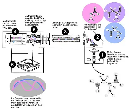 The Orbitrap is a high-resolution Fourier transform mass spectrometer that has recently been adapted to allow for site-specific analyses.[2] Molecules introduced into the Orbitrap are fragmented, accelerated, and analyzed. Because the Orbitrap characterizes molecular masses by measuring oscillations at radio frequencies, it is able to reach very high levels of precision, depending on measurement method (i.e., down to 0.1 per mille for long integration times). It is significantly faster than site-specific isotope measurements that can be performed using NMR, and can measure molecules with different rare isotopes but the same nominal mass at natural abundances (unlike GC and LCMS). It is also widely generalizable to molecules that can be introduced via gas or liquid solvent.[2] Resolution of the Orbitrap is such that nominal isobars (e.g., 2H versus 15N versus 13C enrichments) can be distinguished from one another, and so molecules do not need to be converted into a homogeneous substrate to facilitate isotope analysis. Like other isotope measurements, measurements of site-specific enrichments on the Orbitrap should be compared to a standard of known composition.[2]