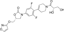 - ^ Wookey A, Turner PJ, Greenhalgh JM, Eastwood M, Clarke J, Sefton C (March 2004). "AZD2563, a novel oxazolidinone: definition of antibacterial spectrum, assessment of bactericidal potential and the impact of miscellaneous factors on activity in vitro". Clinical Microbiology and Infection. 10 (3): 247–54. doi:10.1111/j.1198-743X.2004.00770.x. PMID 15008947.