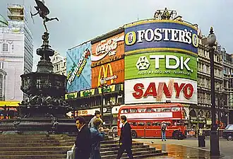 Me Company designed the album artwork, while Martin Gardiner modeled the lotus flower in the booklet and packaging.[20] The album depicts Björk in Piccadilly Circus, London, her pale skin and dark hair contrasting with the colours of the Japanese-inspired signs behind her.[61][22] The photograph was taken on 1 April 1995 by Stéphane Sednaoui.[53] The designer Paul White of Me Company, who had collaborated with Björk since her time with the Sugarcubes,[62] "surrounded her with giant postcards to represent communication with friends and family".[31] Björk said "my musical heart was scattered at the time and I wanted the [cover] to show that".[22]