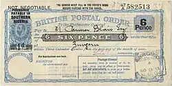 Nigeria became independent from Britain on 1 October 1960 and after then began to issue postal orders in its own right denominated in Nigerian pounds, shillings, and pence, although records at the British Library indicate that these were at first supplied by Britain's Crown Agents. A number of proof Nigerian postal orders dated 1964 and 1965 are contained in the Crown Agents Archive of the British Library Philatelic Collection.[3] New postal orders were issued in 1973, when Nigeria changed over to the decimal currency of the Naira.[4][5]