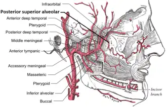 The posterior superior alveolar artery (posterior dental artery) is a branch of the maxillary artery.[1][2] It is one of two or three superior alveolar arteries. It provides arterial supply to the molar and premolar teeth, maxillary sinus and adjacent bone, and the gingiva.[2]