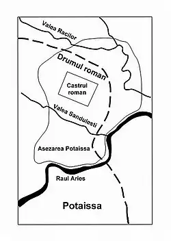 The spring supplying the fort with water is at "The Spring of the Romans" southwest of Copăceni village, on the right side of the Turda - Petreștii de Jos road.[7] From here the water was led through an aqueduct about 5 km long to the fortress. A second aqueduct, starting from the same source, supplied water to the city of Potaissa also at a distance of about 5 km.